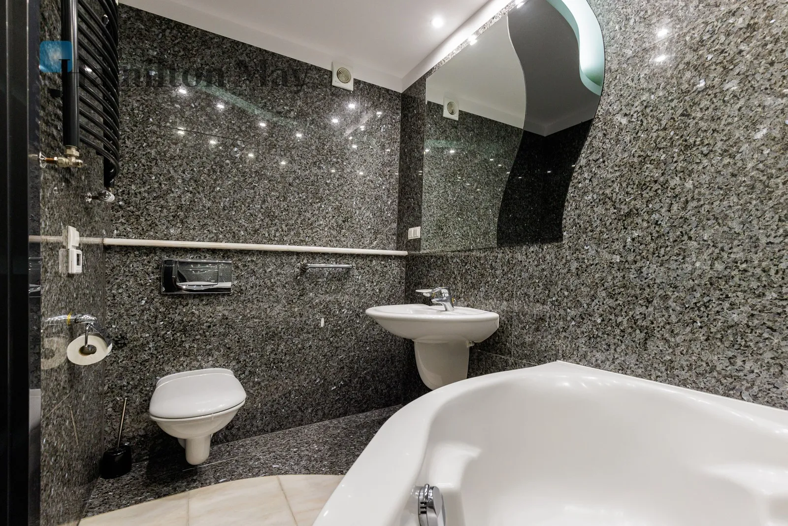 Mieszkanie wykończone zostało z dbałością o każdy detal, przy użyciu wysokiej klasy materiałów. Wnętrza zachwycają ponadczasową elegancją oraz solidnymi wykończeniami.
