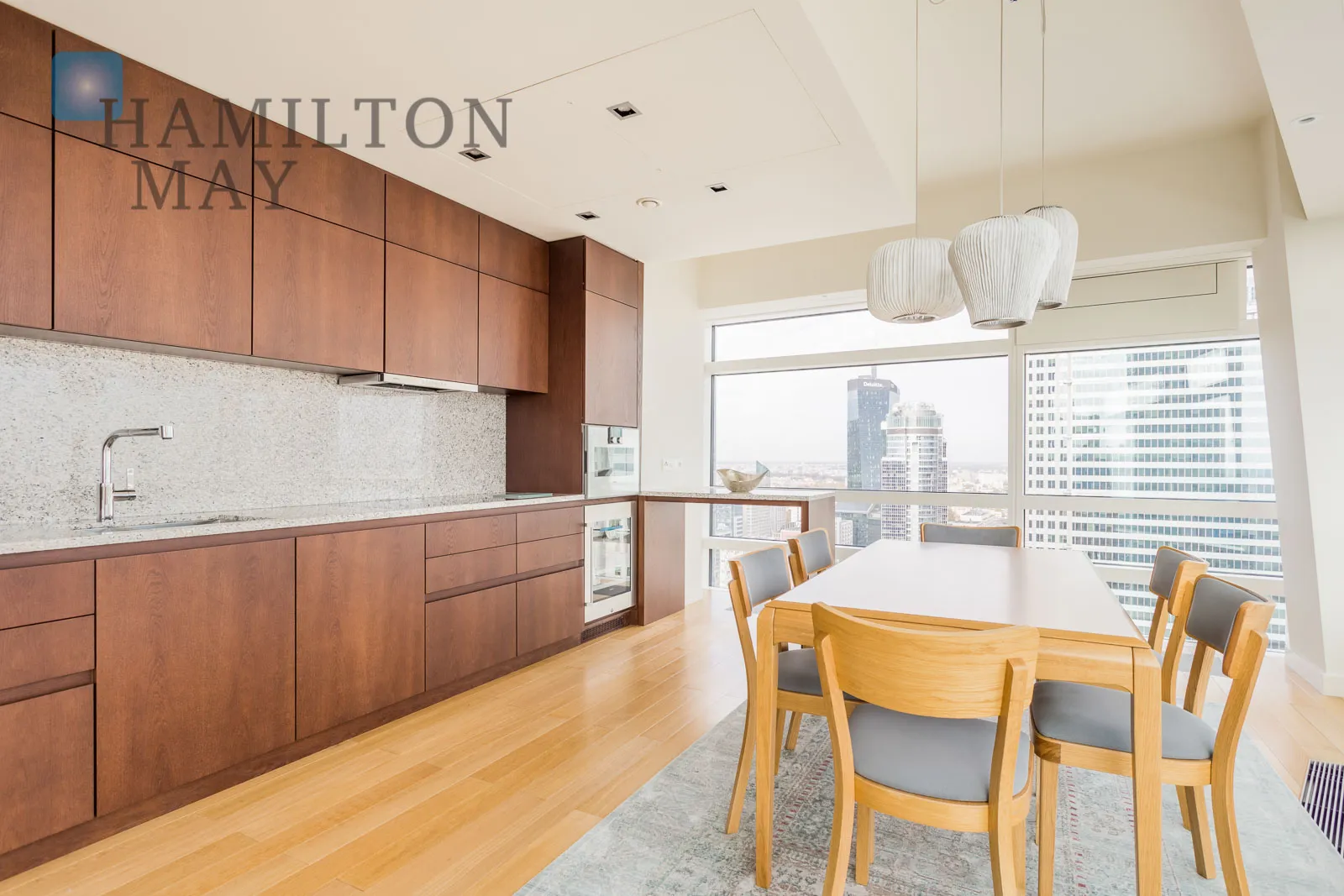 Apartament jest wykończony z najwyższej klasy materiałów, jest w pełni umeblowany i wyposażony. Okna z sypialni wychodzą na północ, natomiast z salonu i kuchni na wschód z widokiem na Pałac Kultury. Do apartamentu przynależy jedno miejsce w garażu podziemnym.